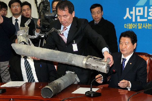 資料圖片:當(dāng)?shù)貢r間11月25日,韓國國大黨公布兩枚朝鮮炮彈的殘骸,譴責(zé)朝鮮炮擊延坪島的行為。韓國總統(tǒng)李明博在當(dāng)日舉行的緊急安保會議上表示,在西部海域五島等最容易遭受攻擊的地方,要“配置世界最強(qiáng)的軍事裝備進(jìn)行徹底的準(zhǔn)備”,以應(yīng)對朝鮮的非對稱戰(zhàn)力。
