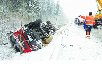 上圖為德國(guó)一段公路上因大雪發(fā)生了交通事故,出事車(chē)輛側(cè)翻在路邊。