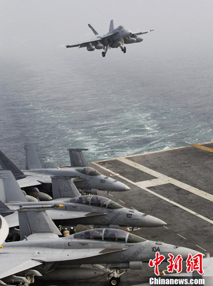參加美韓軍演的美軍艦載機(jī)準(zhǔn)備在航母著艦