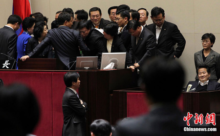 在韓國(guó)議會(huì),這類激烈沖突已經(jīng)屢見不鮮。遇到自己強(qiáng)烈反對(duì)的議案或者提議時(shí),議員們通常會(huì)用“武力”表達(dá)自己的不滿。嚴(yán)重時(shí),議員利用桌椅、滅火器群毆,甚至有人被打掉牙。