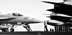 6日,日美聯(lián)合軍演中,美軍士兵正移動(dòng)航母上的一架大黃蜂戰(zhàn)機(jī)。當(dāng)天,兩架俄巡邏機(jī)橫穿軍演空域。