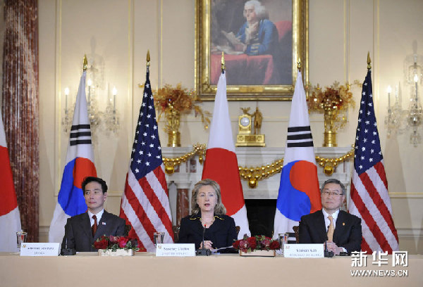 12月6日,在美國首都華盛頓國務(wù)院,美國國務(wù)卿希拉里·克林頓(中)、韓國外交通商部長官金星煥(右)和日本外務(wù)大臣前原誠司舉行會晤。美日韓三國外長當(dāng)日在華盛頓會晤,討論朝鮮半島最新局勢及其對地區(qū)安全的影響。新華社記者張軍攝