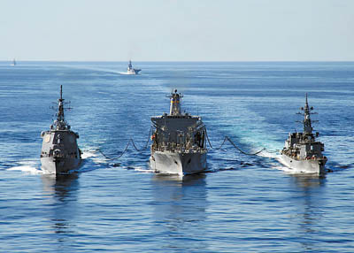 12月4日,美日艦隊(duì)正在舉行軍演。美軍“喬治·華盛頓”號(hào)航空母艦編隊(duì)中的“蒂珀·卡努”號(hào)補(bǔ)給船(T-AO199)給日本海上自衛(wèi)隊(duì)“村雨”級(jí)驅(qū)逐艦DD-107“雷”號(hào)和“金剛”級(jí)導(dǎo)彈驅(qū)逐艦DDG-173“金剛”號(hào)加油。