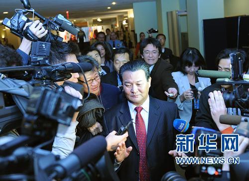 12月19日,在紐約聯(lián)合國(guó)總部安理會(huì)磋商室外,記者包圍采訪朝鮮常駐聯(lián)合國(guó)代表申善昊(中)。當(dāng)日,聯(lián)合國(guó)安理會(huì)就朝鮮半島局勢(shì)舉行緊急閉門磋商。新華社記者申宏攝