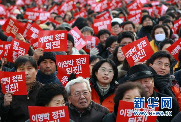 12月18日,在韓國(guó)首爾火車(chē)站,人們手舉標(biāo)語(yǔ),高喊口號(hào),要求李明博政府下臺(tái)。 新華社發(fā)(樸真熙攝)