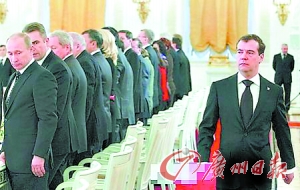 會議期間,當(dāng)梅德韋杰夫發(fā)言的時候,普京一副不高興的表情。