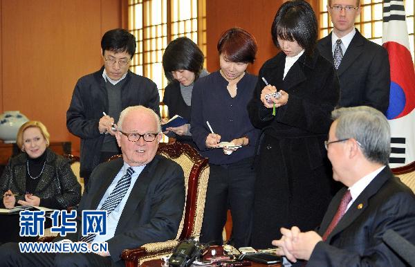 2011年1月5日美國朝鮮問題特使訪韓1月5日,在韓國首爾,美國朝鮮問題特使斯蒂芬·博斯沃思(左)與朝核問題六方會(huì)談韓國團(tuán)團(tuán)長(zhǎng)魏圣洛(右)會(huì)談。