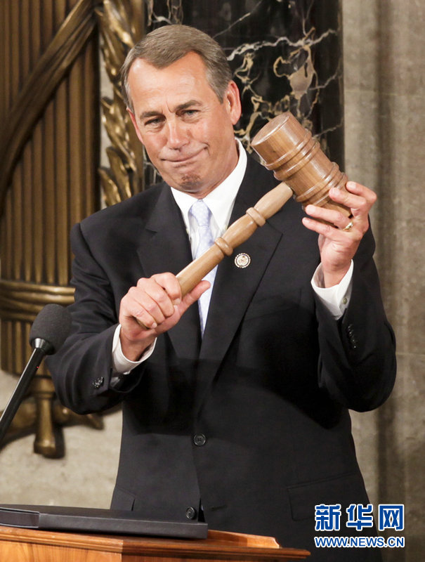 1月5日,在美國首都華盛頓國會(huì)山,新當(dāng)選的美國國會(huì)眾議院議長約翰·博納展示議長木槌。當(dāng)天,美國新一屆國會(huì)議員正式宣誓就職,共和黨人約翰·博納當(dāng)選新任眾議院議長。 新華社發(fā)(尤里·格里帕斯攝)