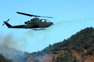 6日,延坪島,一架AH-1S直升機在演習中發(fā)射火箭彈。韓國媒體7日報道,朝韓美三國近日均下調(diào)了“備戰(zhàn)”級別,朝鮮半島局勢出現(xiàn)緩和。