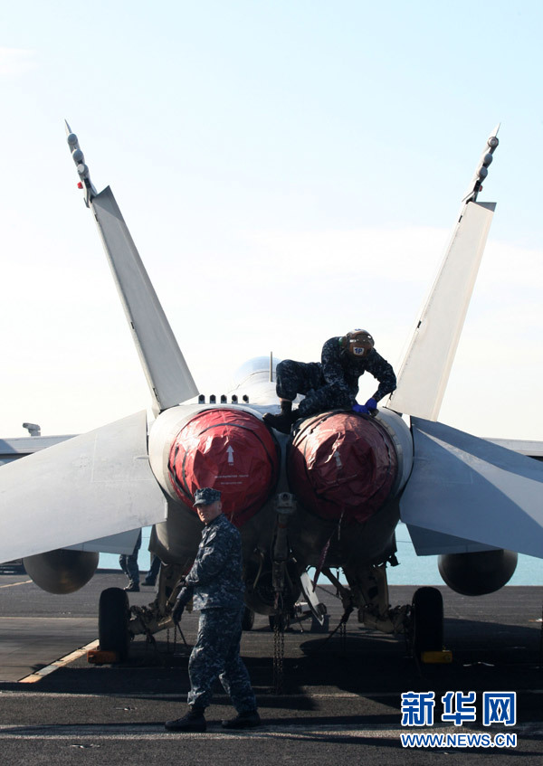 1月11日,在韓國(guó)釜山,士兵在“卡爾·文森”號(hào)航母上工作。當(dāng)日,美國(guó)海軍核動(dòng)力航空母艦“卡爾·文森”號(hào)抵達(dá)韓國(guó)海軍作戰(zhàn)司令部釜山基地。 新華社發(fā)(樸真熙 攝)