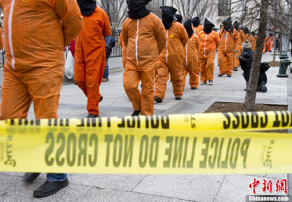 1月11日,美國華盛頓,示威者穿著橙色的囚服游行,要求關閉關塔那摩監(jiān)獄。當天是關塔那摩監(jiān)獄建立9周年紀念日。