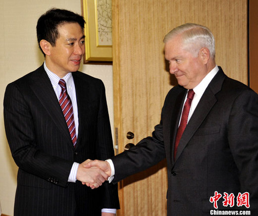 1月13日上午,日本外務大臣前原誠司(左)在日本東京外務省會見了前來訪問的美國國防部長蓋茨(右)。中新社發(fā)