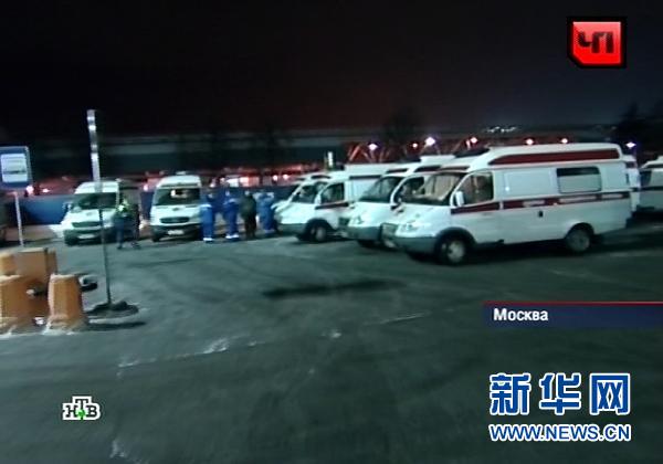 這張俄羅斯NTV電視臺視頻截圖顯示在莫斯科多莫杰多沃機(jī)場外等待進(jìn)行救援的救護(hù)車。新華社/法新