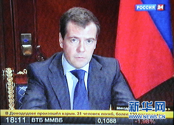 1月24日,俄羅斯總統(tǒng)梅德韋杰夫通過電視表示,已下令有關(guān)部門組建調(diào)查小組,偵破當(dāng)天發(fā)生的莫斯科多莫杰多沃機(jī)場爆炸案。當(dāng)?shù)貢r(shí)間24日16時(shí)32分,莫斯科多莫杰多沃機(jī)場發(fā)生爆炸,截至目前已造成31人死亡,130多人受傷。俄強(qiáng)力機(jī)關(guān)已將其作為恐怖襲擊立案偵查。新華社記者 趙嘉麟攝