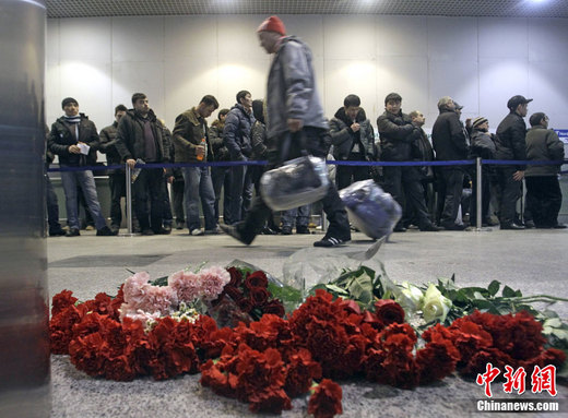 1月25日,俄羅斯多莫杰多沃機(jī)場大廳擺放鮮花哀悼在炸彈襲擊中喪生的遇難者。24日,俄羅斯莫斯科多莫杰多沃機(jī)場抵達(dá)大廳內(nèi)發(fā)生自殺式炸彈爆炸。