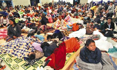 圖片說明:泰國一個臨時收容所內(nèi)住滿逃難的邊境村民。