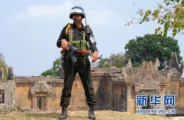 柬埔寨軍方人士2月4日說,當天下午柬埔寨和泰國邊防軍在柏威夏地區(qū)發(fā)生武裝沖突,目前雙方傷亡情況不明。這是2010年2月6日拍攝的柬埔寨士兵守衛(wèi)在柬泰邊境柏威夏寺的資料照片。新華社/法新