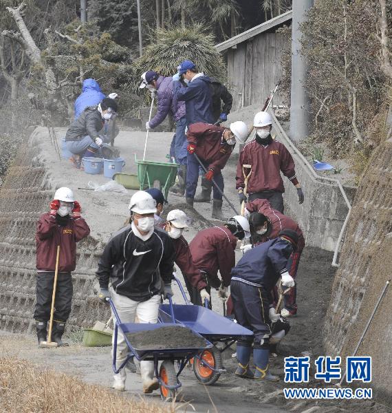 2月6日,在日本宮崎縣城內(nèi),志愿者正在清理一處住宅入口處的火山灰。坐落于日本鹿兒島縣和宮崎縣交界處的新燃岳火山近期活動劇烈。 新華社/法新