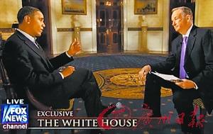 奧巴馬(左)接受福克斯新聞臺(tái)現(xiàn)場(chǎng)直播主持人奧賴?yán)麑TL。