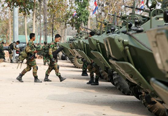 2月9日,大批柬埔寨士兵駐扎在柬泰邊境柏威夏寺附近地區(qū),為可能再次爆發(fā)的柬泰武裝沖突做準(zhǔn)備。