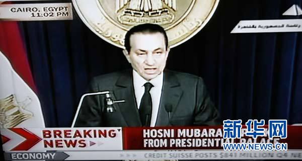 這張2月10日拍攝的電視截圖顯示,埃及總統(tǒng)穆巴拉克發(fā)表電視講話。埃及總統(tǒng)穆巴拉克當(dāng)晚發(fā)表電視講話宣布將部分權(quán)力移交給副總統(tǒng)蘇萊曼。 新華社發(fā)