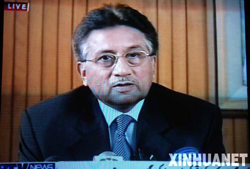 這張2008年8月18日攝自巴基斯坦國家電視臺的電視照片顯示,巴基斯坦總統(tǒng)穆沙拉夫向全國發(fā)表電視講話宣布辭職。 新華社發(fā)