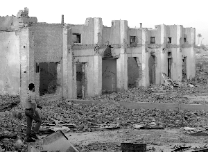 一名巴格達(dá)人走過(guò)一片建筑廢墟。巴格達(dá)政府17日發(fā)出聲明,要求美國(guó)為8年伊戰(zhàn)賠償該市10億美元。