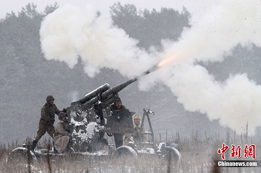 2月20日,在烏克蘭基輔郊外,數(shù)百名士兵身穿二戰(zhàn)時(shí)期軍服,再現(xiàn)二戰(zhàn)時(shí)期蘇聯(lián)紅軍與德軍激戰(zhàn)情景。