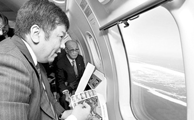 2月19日,日本內(nèi)閣官房長官枝野幸男搭乘飛機從空中視察日本主張擁有主權的“北方四島”。