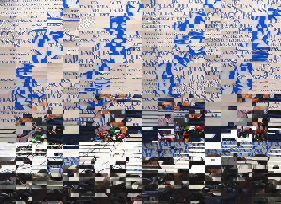 2011年2月21日,前蘇聯(lián)總統(tǒng)戈爾巴喬夫(中)在俄羅斯首都莫斯科出席一場新聞發(fā)布會。