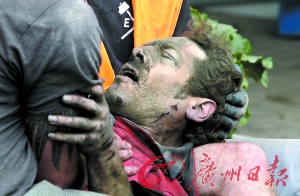 一名男子被救援人員從廢墟中救出。
