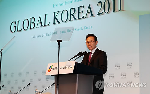 李明博24日出席在首爾樂天酒店舉行的“第三屆世界韓國國際學術(shù)會議”,并發(fā)表講話。(韓聯(lián)社)