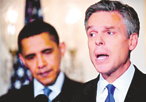 美駐華大使洪博培(右),被視為將在2012年總統(tǒng)競(jìng)選中挑戰(zhàn)奧巴馬的共和黨人。