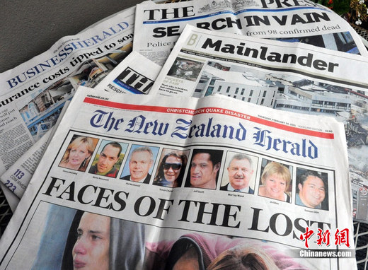 自新西蘭克萊斯特徹奇(基督城)發(fā)生里氏6.3級(jí)地震以來(lái),新西蘭主要媒體連日來(lái)都以地震作為頭條新聞。