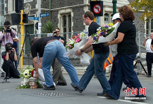 新西蘭政府宣布3月1日為全國(guó)哀悼日。在地震發(fā)生時(shí)的12時(shí)51分,新西蘭總理約翰·基要求全國(guó)民眾默哀兩分鐘。圖為新西蘭民眾向地震遇難者敬獻(xiàn)鮮花。
