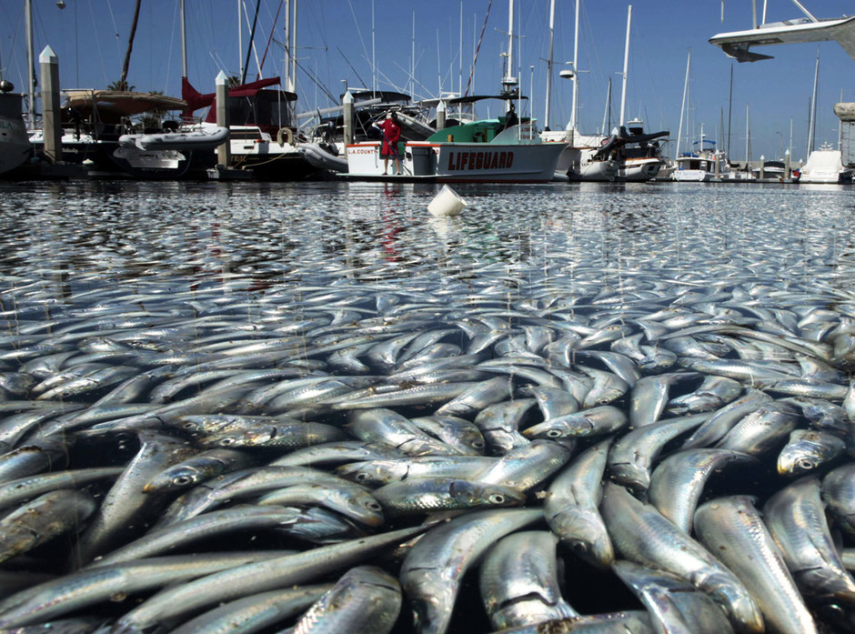 加州洛杉磯以南的海灣區(qū)突然出現(xiàn)數(shù)百萬條死魚,包括鳳尾魚、鯖魚、沙丁魚和其它小魚。當(dāng)?shù)匾幻桨l(fā)言人說,死魚大約有一英尺那么深,國王碼頭(King Harbor Marina)幾十條私人船只周圍到處是死魚。