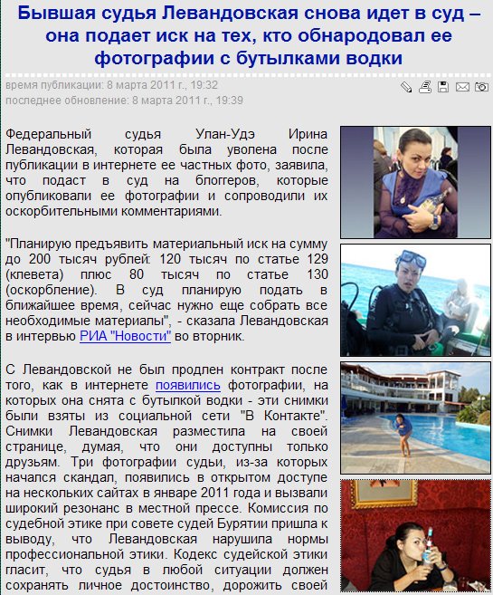 據(jù)悉,這些照片中最具爭(zhēng)議的是:她拿著一個(gè)玻璃酒瓶,用舌頭舔酒瓶的下半部分,眼睛斜視著拍攝者。這些照片迅速在網(wǎng)上傳播,有些人甚至對(duì)其謾罵和言語(yǔ)攻擊。2011年1月,這些照片開始出現(xiàn)在多家網(wǎng)站上,并在烏蘭烏德當(dāng)?shù)匦侣劽襟w中引起轟動(dòng)。布里亞特共和國(guó)法官職業(yè)操守委員會(huì)據(jù)此做出結(jié)論,伊琳娜·列萬(wàn)多夫斯卡婭違反了職業(yè)道德,決定解除其法官職務(wù)。