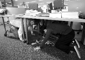 11日,日本東京,美聯(lián)社東京局的記者們在地震時躲到桌下。