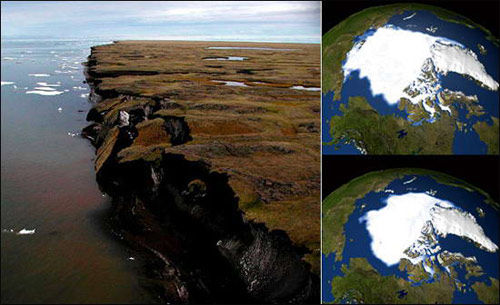 當(dāng)季節(jié)發(fā)生變化時(shí),會(huì)引起冰帽融化和再生,但是永久凍結(jié)帶的侵蝕持續(xù)時(shí)間更長(zhǎng)。由于全球變暖導(dǎo)致岸邊富含沉淀物的凍土融化,海水更容易侵蝕海岸和陸地,北極地區(qū)的海岸線正處于危險(xiǎn)之中。圖片上是,美國(guó)阿拉斯加州東北部的波弗特海岸受到氣候變化影響。