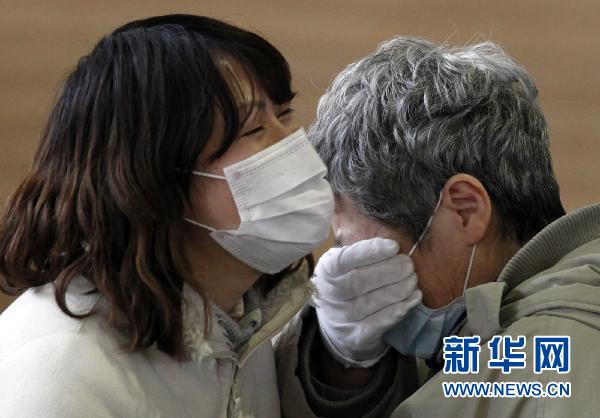 3月15日,在日本巖手縣的一個(gè)臨時(shí)避難所內(nèi),一名婦女與親人團(tuán)聚后哭泣。 新華社/路透