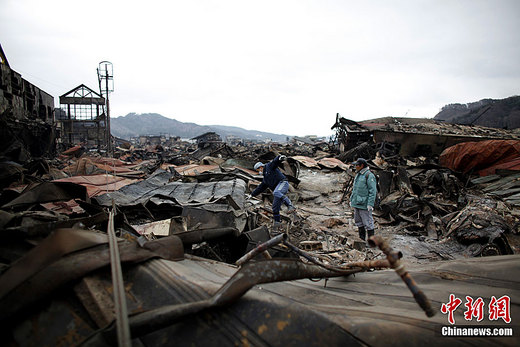 3月15日,日本9.0級(jí)大地震和海嘯過(guò)去后。日本巖手縣的一個(gè)小鎮(zhèn)變成了一片瓦礫,人們?cè)谶@片地區(qū)搜索被困人員和能夠使用的物品。