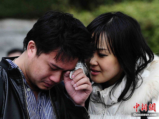 3月14日下午,一名日本女性在安慰身邊哭泣的男性。當(dāng)天部分仙臺民眾在市政府前的車站乘坐大巴,準(zhǔn)備前往鄰接的山形縣暫時避難。中新社發(fā) 侯宇 攝