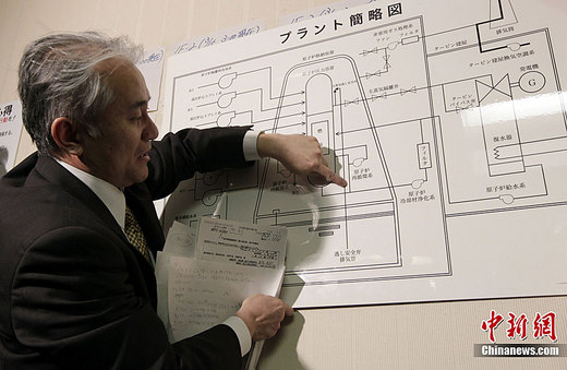 日本政府表示,當(dāng)?shù)貢r間15日晨6時10分左右,福島第一核電站2號反應(yīng)堆附近傳來爆炸聲。早些時候的報道指出,福島第一核電站2號反應(yīng)堆容器出現(xiàn)部分破損,這表明可能導(dǎo)致更為嚴(yán)重的核泄漏。圖為日本東京核電官員用結(jié)構(gòu)圖講解福島第一核電站2號機(jī)組爆炸情況。