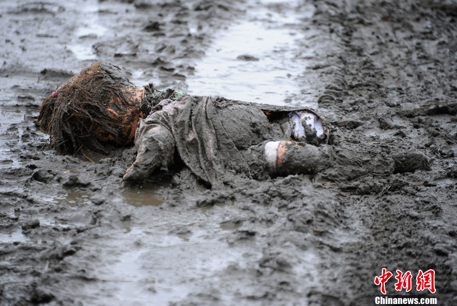 2011年3月16日,日本宮城縣名取市,一個(gè)洋娃娃趴在滿地污泥中。