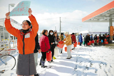 日本地震重災區(qū)巖手縣本周三開始下大雪,避難所都沒有暖氣,令災情雪上加霜。圖為市民在加油站輪購汽油。