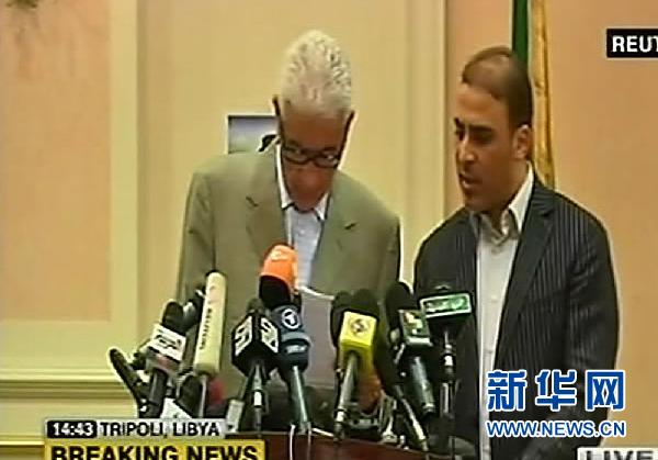 這張3月18日的電視截圖顯示,利比亞外長穆薩·庫薩(左)在宣讀聲明。利比亞外長穆薩·庫薩當(dāng)日宣布,利比亞接受聯(lián)合國有關(guān)在利比亞設(shè)立禁飛區(qū)的決議,立即;鸩⑼V顾熊娛滦袆。 新華社發(fā)
