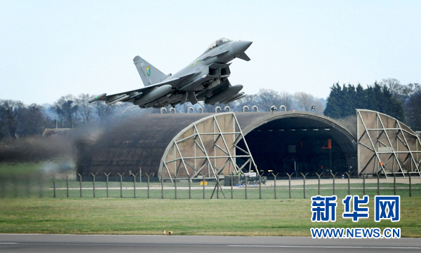 這張英國國防部3月20日提供的照片顯示,一架英國空軍“臺(tái)風(fēng)”式戰(zhàn)斗機(jī)從英國林肯郡一個(gè)空軍基地起飛參加對(duì)利比亞軍事行動(dòng)。英國國防部20日說,皇家空軍“旋風(fēng)”戰(zhàn)機(jī)已從英國東部諾?丝わw赴利比亞,執(zhí)行轟炸任務(wù)。19日的行動(dòng)主要針對(duì)利比亞防空體系,英國對(duì)于第一階段空中打擊利比亞的結(jié)果“十分滿意”。新華社發(fā)(英國國防部照片)