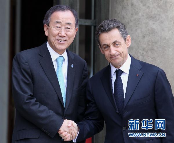 3月19日,法國總統(tǒng)薩科齊在巴黎愛麗舍宮迎接前來參加巴黎峰會的聯(lián)合國秘書長潘基文。當(dāng)日,法國召開旨在落實(shí)聯(lián)合國安理會關(guān)于利比亞決議的國際峰會。 新華社記者高靜攝