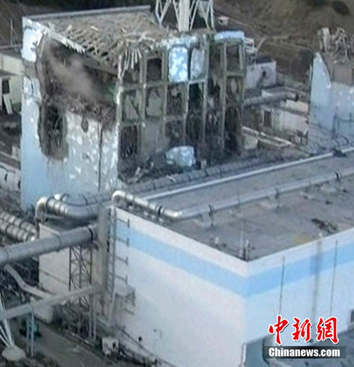 3月16日,由日本自衛(wèi)隊(duì)員在直升機(jī)上拍攝的福島第一核電站第四反應(yīng)堆受損近照。