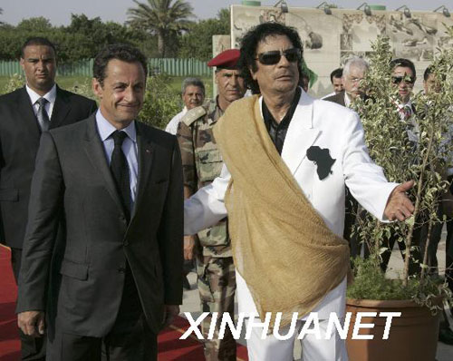 2007年7月薩科奇訪問利比亞,受到卡扎菲親切接近。當(dāng)時(shí),薩科奇在外訪中,積極向利比亞等國推銷“陣風(fēng)”戰(zhàn)斗機(jī)等軍火。(新華網(wǎng)圖片)